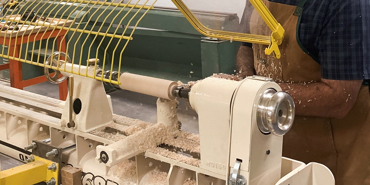 Tour à bois d’atelier dans l’espace de travail central de l’École d’ébénisterie d’art de Montréal | Crédit photo : Virginie Laliberté